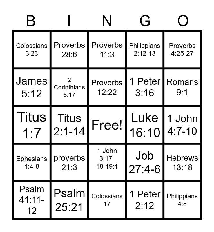 This bingo card has a free space and 24 words: proverbs 21:3, Psalm 25:21, Proverbs 12:22, Psalm 41:11-12, Proverbs 4:25-27, Colossians 3:23, James 5:12, Proverbs 28:6, Luke 16:10, 1 John 3:17-18 19:1, 1 Peter 3:16, Titus 1:7, Job 27:4-6, Hebrews 13:18, 2 Corinthians 5:17, 1 Peter 2:12, 1 John 4:7-10, Proverbs 11:3, Romans 9:1, Titus 2:1-14, Philippians 4:8, Ephesians 1:4-8, Philippians 2:12-13 and Colossians 17.