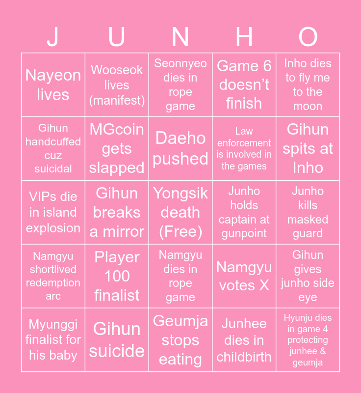This bingo card has a free space and 24 words: Player 100 finalist, Gihun suicide, Daeho pushed, Myunggi finalist for his baby, Inho dies to fly me to the moon, Nayeon lives, Gihun handcuffed cuz suicidal, Wooseok lives (manifest), Junho holds captain at gunpoint, Namgyu dies in rope game, Law enforcement is involved in the games, VIPs die in island explosion, Namgyu votes X, Gihun gives junho side eye, MGcoin gets slapped, Junhee dies in childbirth, Junho kills masked guard, Seonnyeo dies in rope game, Gihun spits at Inho, Gihun breaks a mirror, Hyunju dies in game 4 protecting junhee & geumja, Namgyu shortlived redemption arc, Game 6 doesn’t finish and Geumja stops eating.