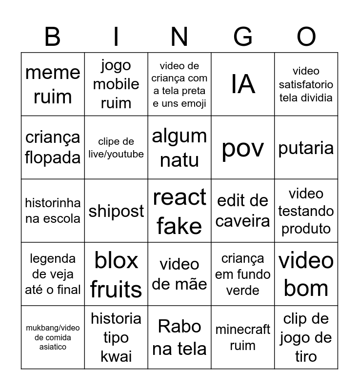 This bingo card has a free space and 24 words: blox fruits, historia tipo kwai, algum natu, mukbang/video de comida asiatico, video satisfatorio tela dividia, meme ruim, criança flopada, jogo mobile ruim, edit de caveira, video de mãe, pov, historinha na escola, criança em fundo verde, video bom, clipe de live/youtube, minecraft ruim, video testando produto, video de criança com a tela preta e uns emoji, putaria, shipost, clip de jogo de tiro, legenda de veja até o final, IA and Rabo na tela.