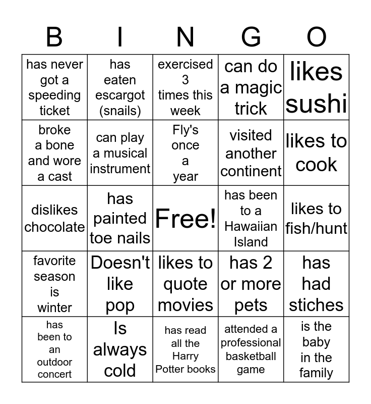 This bingo card has a free space and 24 words: Doesn't like pop, Is always cold, Fly's once a year, has been to an outdoor concert, likes sushi, has never got a speeding ticket, broke a bone and wore a cast, has eaten escargot (snails), has been to a Hawaiian Island, likes to quote movies, visited another continent, dislikes chocolate, has 2 or more pets, has had stiches, can play a musical instrument, attended a professional basketball game, likes to fish/hunt, exercised 3 times this week, likes to cook, has painted toe nails, is the baby in the family, favorite season is winter, can do a magic trick and has read all the Harry Potter books.