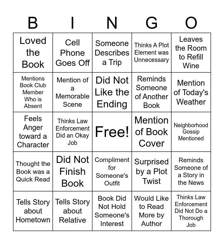 This bingo card has a free space and 24 words: Did Not Finish Book, Tells Story about Relative, Did Not Like the Ending, Tells Story about Hometown, Leaves the Room to Refill Wine, Loved the Book, Mentions Book Club Member Who is Absent, Cell Phone Goes Off, Mention of Book Cover, Compliment for Someone's Outfit, Reminds Someone of Another Book, Feels Anger toward a Character, Surprised by a Plot Twist, Reminds Someone of a Story in the News, Mention of a Memorable Scene, Would Like to Read More by Author, Neighborhood Gossip Mentioned, Someone Describes a Trip, Mention of Today's Weather, Thinks Law Enforcement Did an Okay Job, Thinks Law Enforcement Did Not Do a Thorough Job, Thought the Book was a Quick Read, Thinks A Plot Element was Unnecessary and Book Did Not Hold Someone's Interest.