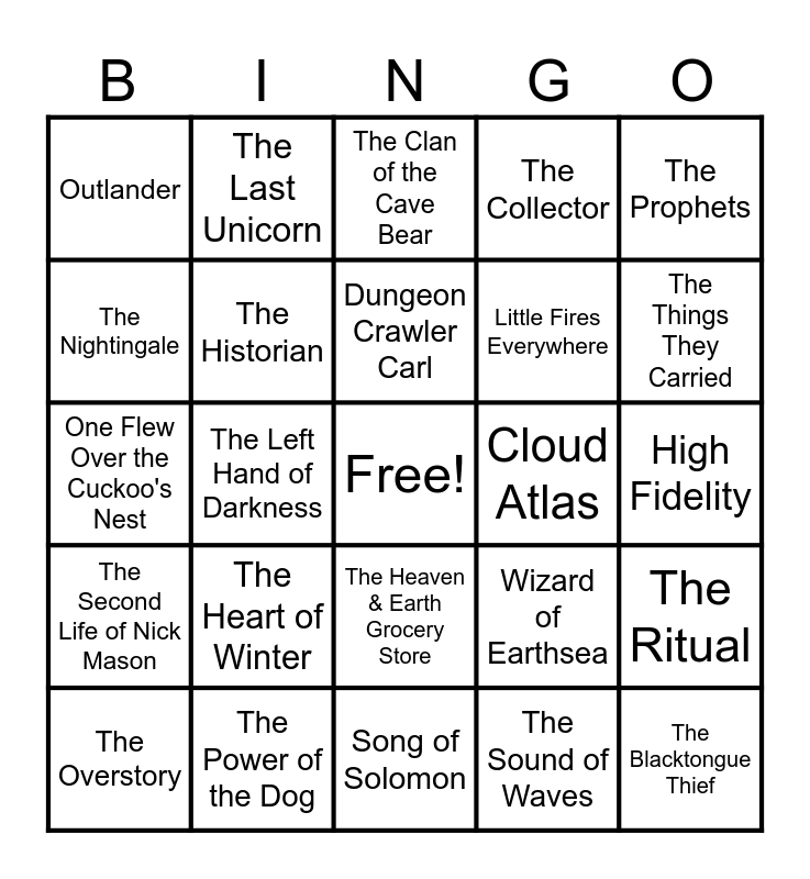 This bingo card has a free space and 80 words: The Monkey Wrench Gang, The Woman in the Dunes, The Clan of the Cave Bear, The Emperor of Gladness, Leave the World Behind, The Amazing Adventures of Kavalier & Clay, Heart of Darkness, White Noise, All the Light We Cannot See, The Bartender's Tale, The Pillars of the Earth, Rock Springs, The Collector, Outlander, The Rabbit Hutch, The Nightingale, A Bright Ray of Darkness, The Heart of Winter, The Dog Stars, High Fidelity, An Artist of the Floating World, The Prophets, One Flew Over the Cuckoo's Nest, Dungeon Crawler Carl, The Historian, Catch 22, Of Mice and Men, Motherless Brooklyn, The Wind-Up Bird Chronicle, The Sympathizer, The Things They Carried, The English Patient, Song of Solomon, The Bluest Eye, The Overstory, Cloud Atlas, Adventures in the Louvre, Buffalo Hunter Hunter, The Lesser Dead, The Blacktongue Thief, Harlem Shuffle, Crook Manifesto, The Witches of Eastwick, The Hitchhiker's Guide to the Galaxy, Foundation, The Last Unicorn, The Salt Line, How to Stop Time, The Midnight Library, The Devil Takes You Home, The Ritual, The Left Hand of Darkness, Wizard of Earthsea, High Fidelity, Black River, The World's Strongest Librarian, This House of Sky, The Emerald Mile, The Wake of Forgiveness, The Heaven & Earth Grocery Store, Little Fires Everywhere, A Gentleman in Moscow, Table For Two, The Killer Inside Me, I Don't Want to Be a Frog, The Sound of the Mountain, James, Blacktop Wasteland, Old Man's War, The Kaiju Preservation Society, The Second Life of Nick Mason, The Power of the Dog, Ordinary Monsters, A Memory of Empire, Love in the Time of Cholera, The Sailor Who Fell From Grace With the Sea, The Sound of Waves, The Remains of the Day, Blood Meridian and Small World.