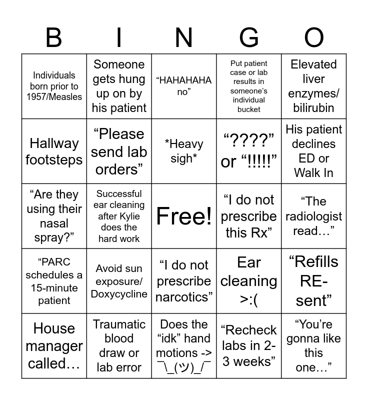 This bingo card has a free space and 24 words: Avoid sun exposure/ Doxycycline, Traumatic blood draw or lab error, *Heavy sigh*, House manager called…, Elevated liver enzymes/ bilirubin, Individuals born prior to 1957/Measles, Hallway footsteps, Someone gets hung up on by his patient, “I do not prescribe this Rx”, “I do not prescribe narcotics”, “????” or “!!!!!”, “Are they using their nasal spray?”, Ear cleaning >:(, “Refills RE-sent”, “Please send lab orders”, “Recheck labs in 2-3 weeks”, “The radiologist read…”, “HAHAHAHA no”, His patient declines ED or Walk In, Successful ear cleaning after Kylie does the hard work, “You’re gonna like this one…”, “PARC schedules a 15-minute patient, Put patient case or lab results in someone’s individual bucket and Does the “idk” hand motions -> ¯\_(ツ)_/¯.