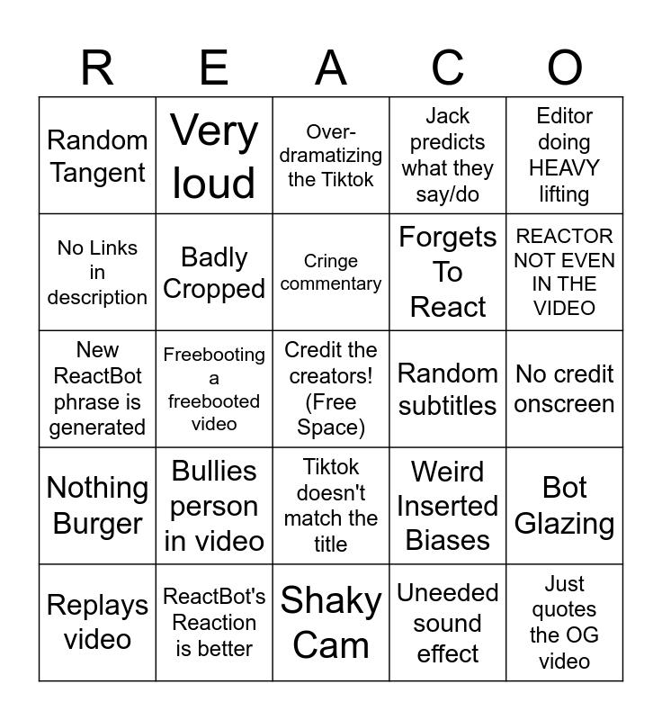 This bingo card has a free space and 38 words: ...that was it?, "This is me...", Actual Insight, Badly Cropped, Bot Glazing, Bullies person in video, Cringe commentary, Editing Mistake, Editor doing HEAVY lifting, Forgets To React, Freebooting a freebooted video, Jack predicts what they say/do, Just quotes the OG video, No credit onscreen, No Links in description, Nothing Burger, Only reacts with a laugh, Over-dramatizing the Tiktok, Random Graphic that adds nothing, Random subtitles, Random Tangent, ReactBot's Reaction is better, REACTOR NOT EVEN IN THE VIDEO, Replays video, Says something that makes no sense, Shaky Cam, Sponsored "Content", Steals someone's joke, Stock meme clip inserted to carry, Summarizing the Video, Talking over the person in the video, Tiktok doesn't match the title, Uneeded sound effect, Very loud, Weird flex, Weird Inserted Biases, New ReactBot phrase is generated and "This guy" (creator vaguely referenced).