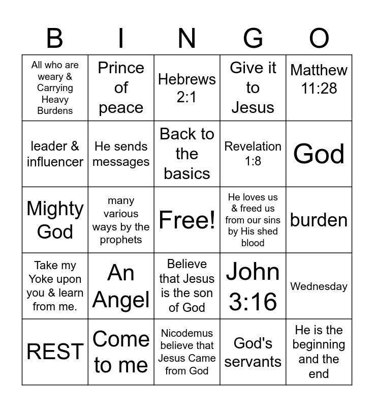 This bingo card has a free space and 29 words: REST, gentle & humble in heart, many various ways by the prophets, Blessed are those who hear, All who are weary & Carrying Heavy Burdens, Hebrews 2:1, He sends messages, An Angel, He loves us & freed us from our sins by His shed blood, Come to me, burden, He is the beginning and the end, Nicodemus believe that Jesus Came from God, God's servants, God, world might be saved through Him, Believe that Jesus is the son of God, Take my Yoke upon you & learn from me., Matthew 11:28, Mighty God, John 3:16, He is the reflection of God's Glory, Revelation 1:8, leader & influencer, Give it to Jesus, Prince of peace, Wednesday, Back to the basics and Chasing after things to find meaning.