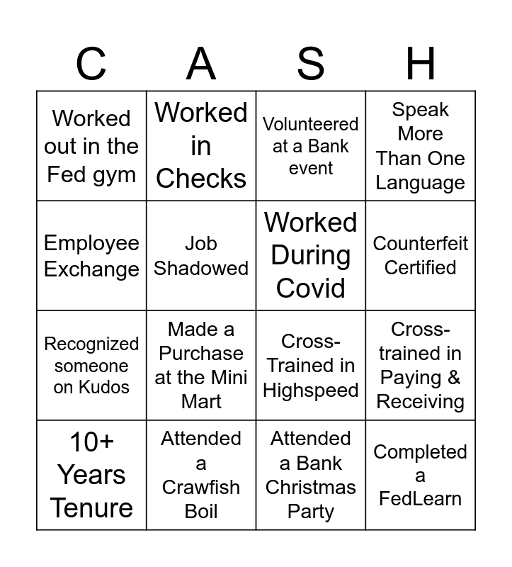 This bingo card has 16 words: Attended a Crawfish Boil, Cross-trained in Paying & Receiving, Volunteered at a Bank event, Worked out in the Fed gym, Recognized someone on Kudos, Worked in Checks, Cross-Trained in Highspeed, Attended a Bank Christmas Party, Employee Exchange, Job Shadowed, 10+ Years Tenure, Speak More Than One Language, Made a Purchase at the Mini Mart, Counterfeit Certified, Worked During Covid and Completed a FedLearn.