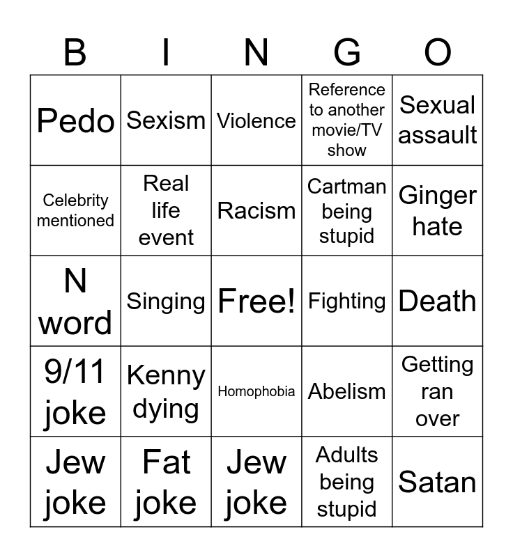 This bingo card has a free space and 24 words: Kenny dying, Fat joke, Racism, Jew joke, Sexual assault, Pedo, Celebrity mentioned, Sexism, Fighting, Homophobia, Cartman being stupid, N word, Abelism, Getting ran over, Real life event, Adults being stupid, Death, Violence, Ginger hate, Singing, Satan, 9/11 joke, Reference to another movie/TV show and Jew joke.