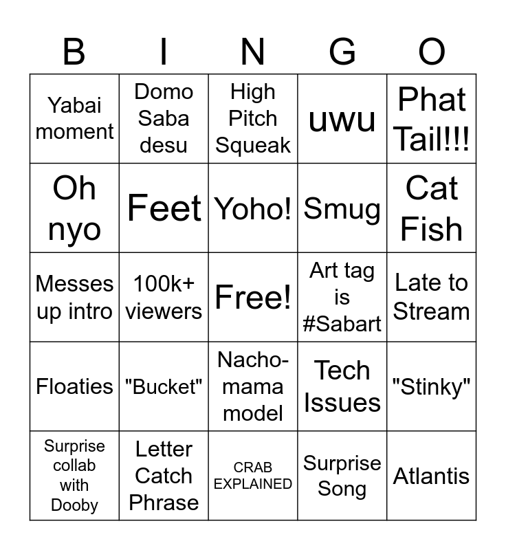 This bingo card has a free space and 24 words: "Bucket", Letter Catch Phrase, Yoho!, Surprise collab with Dooby, Phat Tail!!!, Yabai moment, Oh nyo, Domo Saba desu, Art tag is #Sabart, Nacho-mama model, Smug, Messes up intro, Tech Issues, "Stinky", Feet, Surprise Song, Late to Stream, High Pitch Squeak, Cat Fish, 100k+ viewers, Atlantis, Floaties, uwu and CRAB EXPLAINED.