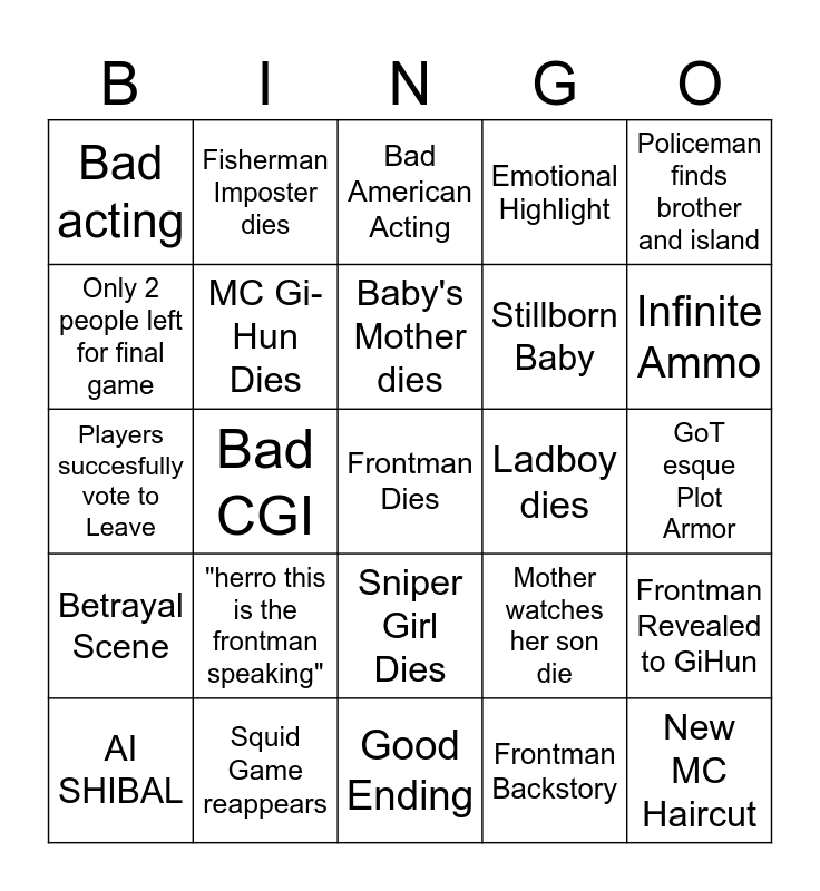 This bingo card has a free space and 24 words: "herro this is the frontman speaking", Squid Game reappears, Baby's Mother dies, AI SHIBAL, Policeman finds brother and island, Bad acting, Only 2 people left for final game, Fisherman Imposter dies, Ladboy dies, Sniper Girl Dies, Stillborn Baby, Players succesfully vote to Leave, Mother watches her son die, Frontman Revealed to GiHun, MC Gi-Hun Dies, Frontman Backstory, GoT esque Plot Armor, Bad American Acting, Infinite Ammo, Bad CGI, New MC Haircut, Betrayal Scene, Emotional Highlight and Good Ending.