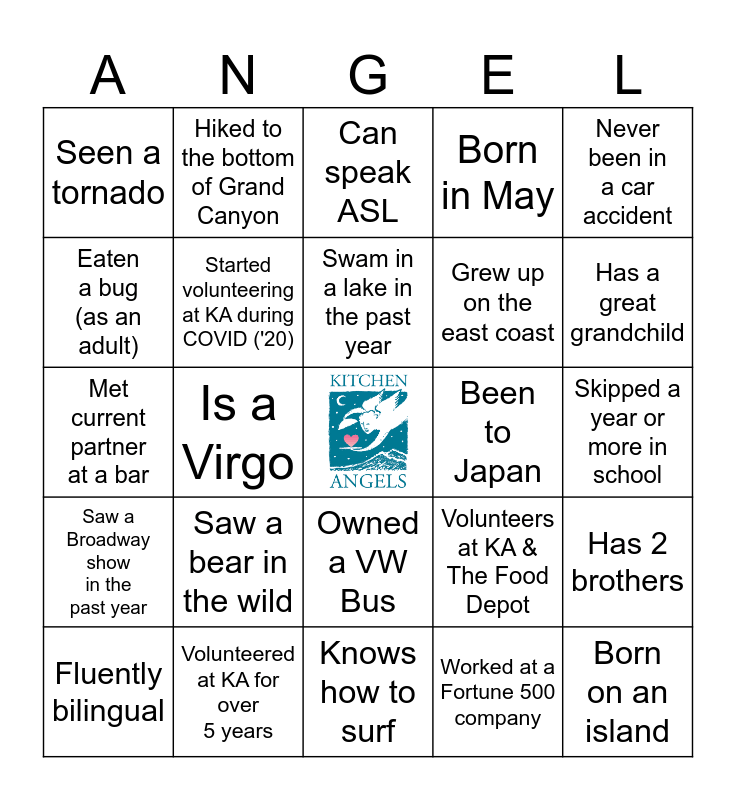 This bingo card has a free space and 24 words: Saw a bear in the wild, Volunteered at KA for over 5 years, Swam in a lake in the past year, Fluently bilingual, Never been in a car accident, Seen a tornado, Eaten a bug (as an adult), Hiked to the bottom of Grand Canyon, Been to Japan, Owned a VW Bus, Grew up on the east coast, Met current partner at a bar, Volunteers at KA & The Food Depot, Has 2 brothers, Started volunteering at KA during COVID ('20), Worked at a Fortune 500 company, Skipped a year or more in school, Can speak ASL, Has a great grandchild, Is a Virgo, Born on an island, Saw a Broadway show in the past year, Born in May and Knows how to surf.