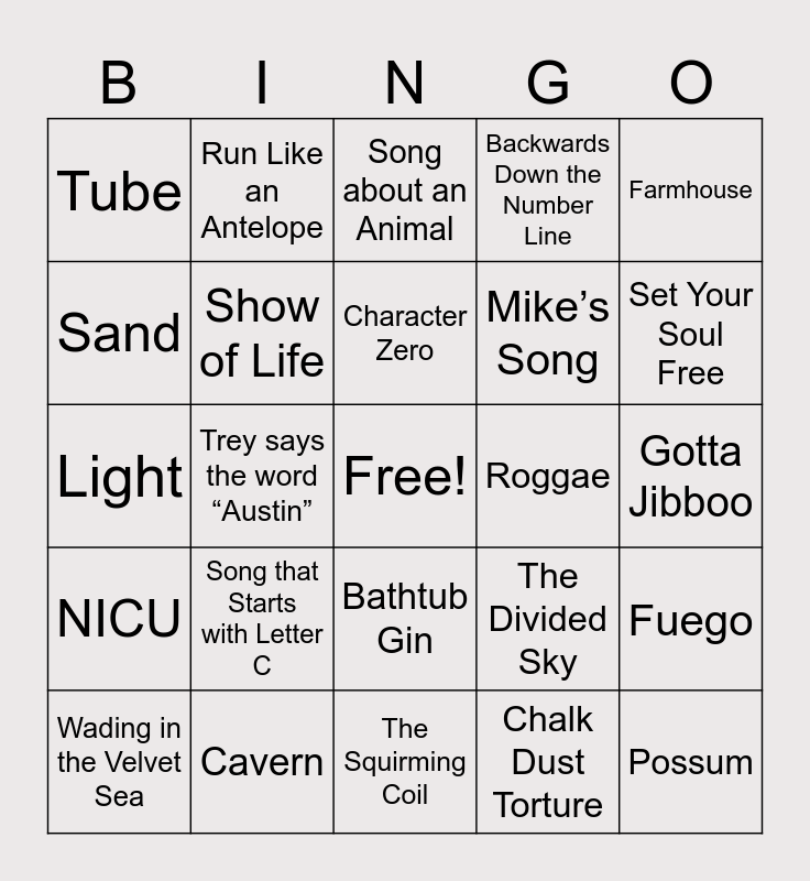 This bingo card has a free space and 26 words: Bathtub Gin, Chalk Dust Torture, Character Zero, Cavern, Farmhouse, Tube, Sand, Run Like an Antelope, Gotta Jibboo, The Divided Sky, Mike’s Song, Light, Fuego, Wading in the Velvet Sea, Trey says the word “Austin”, Weekapaug Groove, Backwards Down the Number Line, NICU, Song about an Animal, Possum, Set Your Soul Free, The Squirming Coil, Roggae, Song that Starts with Letter C, Show of Life and Loving Cup.