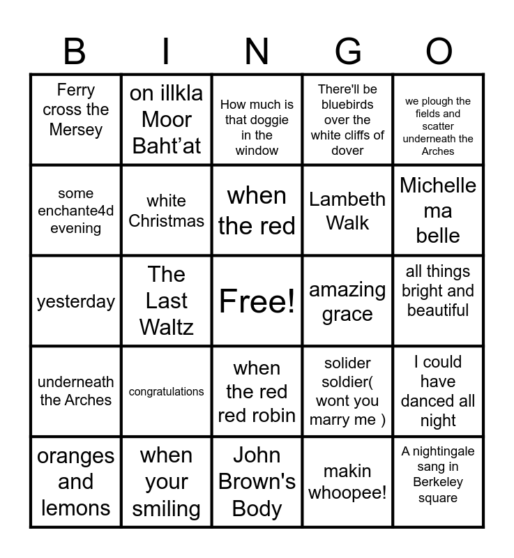 This bingo card has a free space and 41 words: You made me love you, yesterday, yellow submarine, white Christmas, when your smiling, when the red red robin, when the red, what a friend you have in Jesus, we plough the fields and scatter underneath the Arches, underneath the Arches, The Last Waltz, There'll be bluebirds over the white cliffs of dover, A nightingale sang in Berkeley square, all things bright and beautiful, amazing grace, congratulations, do-re-mi, Ferry cross the Mersey, Hark! the Herald Angle Sing, How much is that doggie in the window, I could have danced all night, in the mood, John Brown's Body, Lambeth Walk, land of hope and glory, love me tender, makin whoopee!, men of Harlech, Michelle ma belle, moon river, now is the hour, on illkla Moor Baht’at, oranges and lemons, sally, solider soldier( wont you marry me ), some enchante4d evening, somewhere over the rainbow, stranger on the shore, strangers ion the night, summer holiday and surrey with the fringe on top.