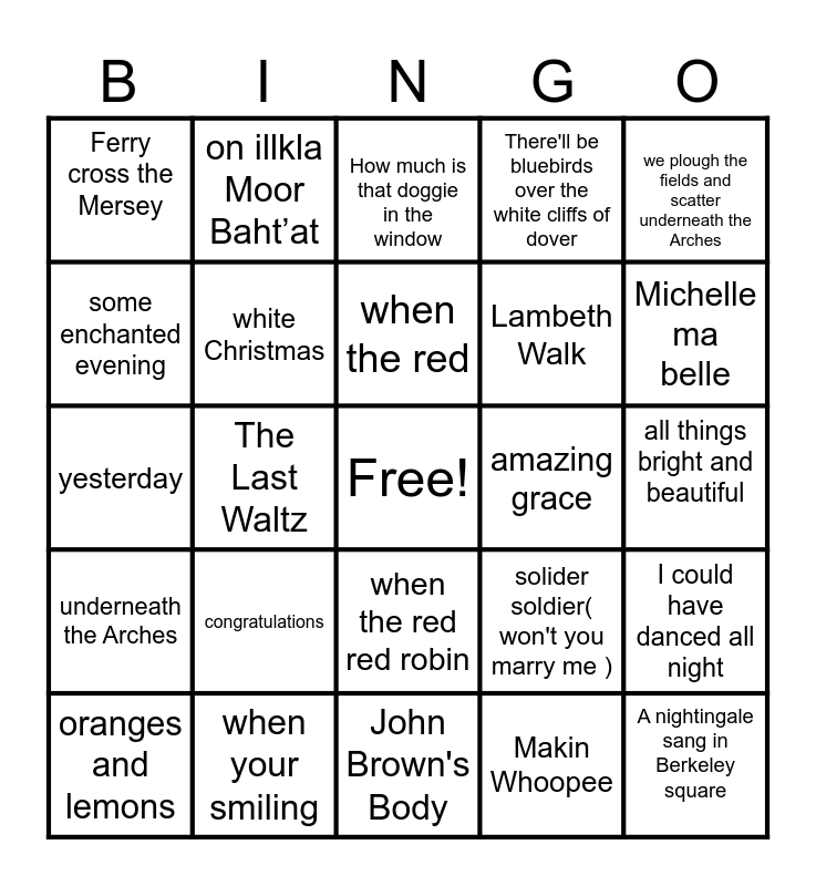 This bingo card has a free space and 41 words: You made me love you, yesterday, yellow submarine, white Christmas, when your smiling, when the red red robin, when the red, what a friend you have in Jesus, we plough the fields and scatter underneath the Arches, underneath the Arches, The Last Waltz, There'll be bluebirds over the white cliffs of dover, A nightingale sang in Berkeley square, all things bright and beautiful, amazing grace, congratulations, do-re-mi, Ferry cross the Mersey, Hark! the Herald Angle Sing, How much is that doggie in the window, I could have danced all night, in the mood, John Brown's Body, Lambeth Walk, land of hope and glory, Love me Tender, Makin Whoopee, men of Harlech, Michelle ma belle, mOON RIVER, now is the hour, on illkla Moor Baht’at, oranges and lemons, sALLY, solider soldier( won't you marry me ), some enchanted evening, somewhere over the rainbow, stranger on the shore, strangers in the night, summer holiday and surrey with the fringe on top.