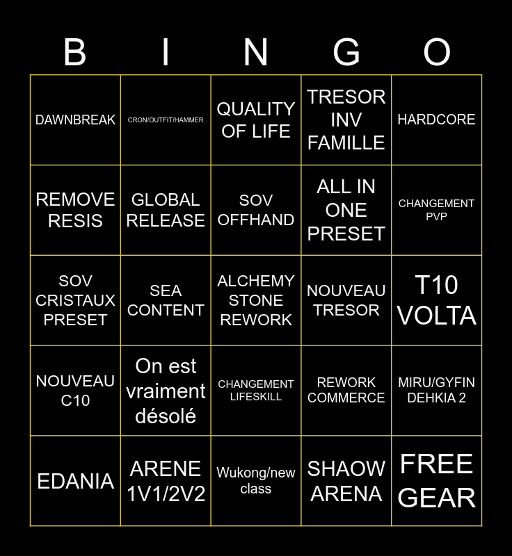 This bingo card has 25 words: On est vraiment désolé, Wukong/new class, SOV OFFHAND, EDANIA, HARDCORE, DAWNBREAK, REMOVE RESIS, CRON/OUTFIT/HAMMER, NOUVEAU TRESOR, CHANGEMENT LIFESKILL, ALL IN ONE PRESET, SOV CRISTAUX PRESET, REWORK COMMERCE, MIRU/GYFIN DEHKIA 2, GLOBAL RELEASE, FREE GEAR, T10 VOLTA, QUALITY OF LIFE, CHANGEMENT PVP, SEA CONTENT, ALCHEMY STONE REWORK, ARENE 1V1/2V2, NOUVEAU C10, TRESOR INV FAMILLE and SHAOW ARENA.