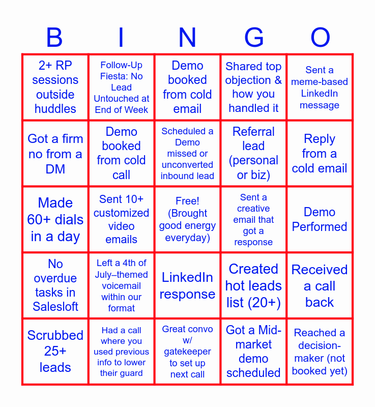 This bingo card has a free space and 24 words: Left a 4th of July–themed voicemail within our format, Had a call where you used previous info to lower their guard, Scheduled a Demo missed or unconverted inbound lead, Scrubbed 25+ leads, Sent a meme-based LinkedIn message, 2+ RP sessions outside huddles, Got a firm no from a DM, Follow-Up Fiesta: No Lead Untouched at End of Week, Sent a creative email that got a response, LinkedIn response, Referral lead (personal or biz), Made 60+ dials in a day, Created hot leads list (20+), Received a call back, Demo booked from cold call, Got a Mid-market demo scheduled, Demo Performed, Demo booked from cold email, Reply from a cold email, Sent 10+ customized video emails, Reached a decision-maker (not booked yet), No overdue tasks in Salesloft, Shared top objection & how you handled it and Great convo w/ gatekeeper to set up next call.