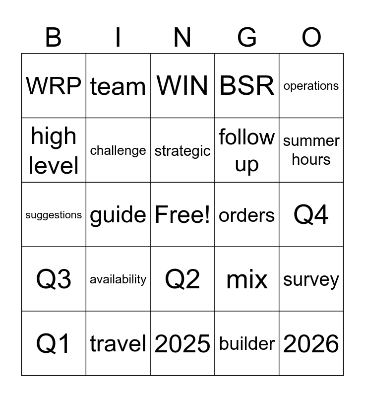 This bingo card has a free space and 29 words: Q1, transition, guide, sales, WRP, WIN, challenge, availability, orders, travel, Q4, 2026, 2025, builder, summer hours, questions, Q2, Q3, operations, suggestions, mix, damaged, follow up, high level, BSR, team, survey, strategic and break.