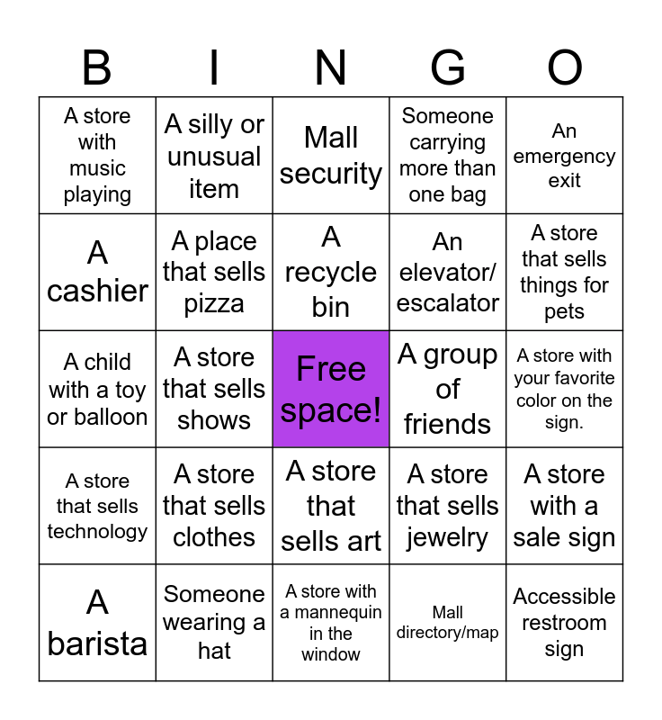 This bingo card has a free space and 24 words: A store that sells clothes, Someone wearing a hat, A recycle bin, A barista, An emergency exit, A store with music playing, A cashier, A silly or unusual item, A group of friends, A store that sells art, An elevator/ escalator, A child with a toy or balloon, A store that sells jewelry, A store with a sale sign, A place that sells pizza, Mall directory/map, A store with your favorite color on the sign., Mall security, A store that sells things for pets, A store that sells shows, Accessible restroom sign, A store that sells technology, Someone carrying more than one bag and A store with a mannequin in the window.