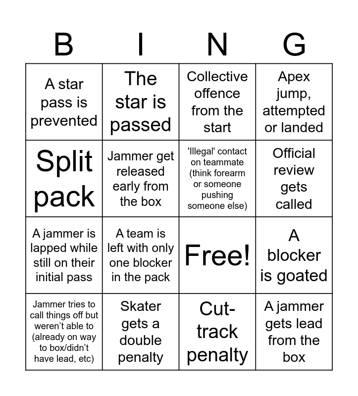 This bingo card has 19 words: Free!, 2-minute jam (either no lead jammer, or lead is lost), Collective offence from the start, A jammer gets lead from the box, A blocker is goated, Split pack, Cut-track penalty, A star pass is prevented, The star is passed, A jammer is lapped while still on their initial pass, A team is left with only one blocker in the pack, Jammer get released early from the box, 'Illegal' contact on teammate (think forearm or someone pushing someone else), Skater gets a double penalty, Jammer tries to call things off but weren’t able to (already on way to box/didn’t have lead, etc), Illegal start, Apex jump, attempted or landed, Official review gets called and A jammer successfully or attempts to “eat the baby”.
