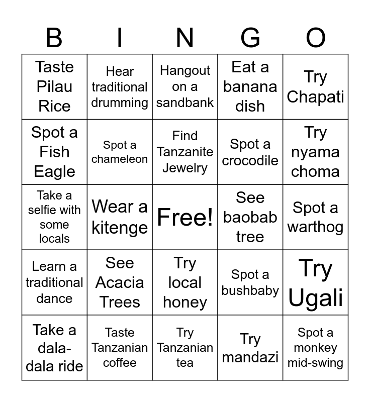 This bingo card has a free space and 24 words: See Acacia Trees, Taste Tanzanian coffee, Find Tanzanite Jewelry, Take a dala-dala ride, Try Chapati, Taste Pilau Rice, Spot a Fish Eagle, Hear traditional drumming, See baobab tree, Try local honey, Spot a crocodile, Take a selfie with some locals, Spot a bushbaby, Try Ugali, Spot a chameleon, Try mandazi, Spot a warthog, Hangout on a sandbank, Try nyama choma, Wear a kitenge, Spot a monkey mid-swing, Learn a traditional dance, Eat a banana dish and Try Tanzanian tea.