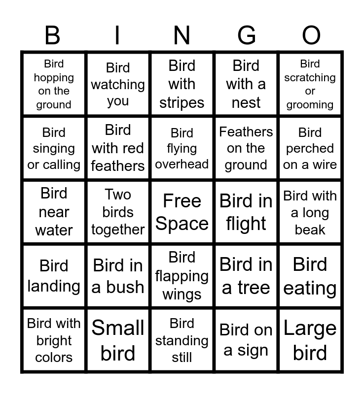 This bingo card has a free space and 24 words: Bird in a bush, Small bird, Bird flying overhead, Bird with bright colors, Bird scratching or grooming, Bird hopping on the ground, Bird singing or calling, Bird watching you, Bird in flight, Bird flapping wings, Feathers on the ground, Bird near water, Bird in a tree, Bird eating, Bird with red feathers, Bird on a sign, Bird with a long beak, Bird with stripes, Bird perched on a wire, Two birds together, Large bird, Bird landing, Bird with a nest and Bird standing still.