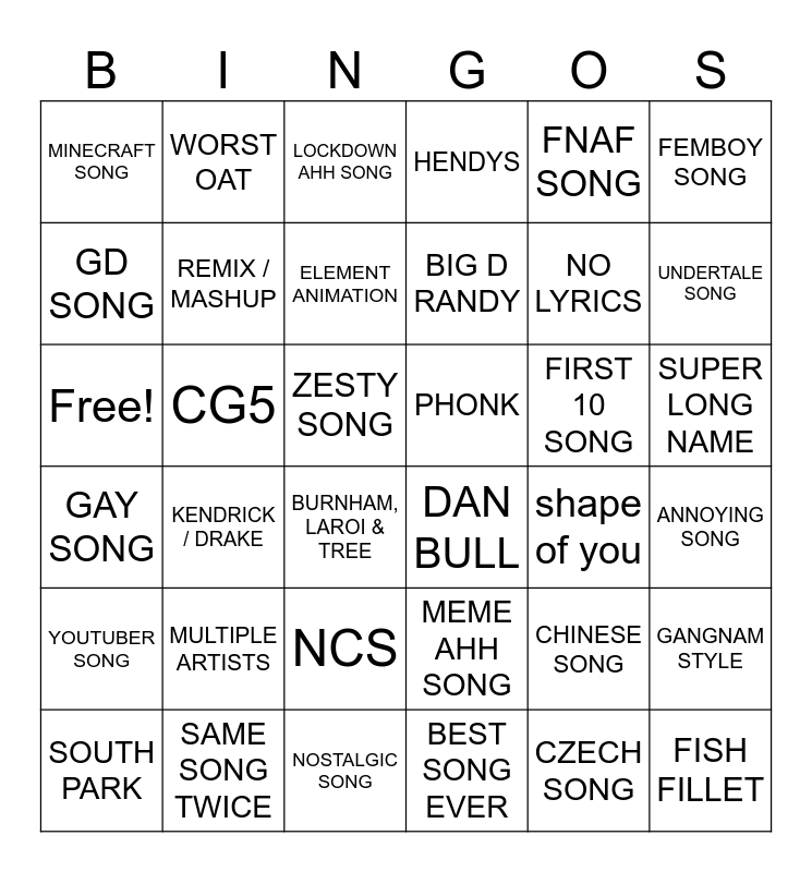 This bingo card has 36 words: MEME AHH SONG, NCS, BEST SONG EVER, GD SONG, GAY SONG, PHONK, REMIX / MASHUP, NOSTALGIC SONG, FNAF SONG, CHINESE SONG, UNDERTALE SONG, HENDYS, GANGNAM STYLE, CG5, BIG D RANDY, MINECRAFT SONG, YOUTUBER SONG, FIRST 10 SONG, Free!, LOCKDOWN AHH SONG, ZESTY SONG, KENDRICK / DRAKE, DAN BULL, BURNHAM, LAROI & TREE, shape of you, WORST OAT, NO LYRICS, SAME SONG TWICE, ELEMENT ANIMATION, FEMBOY SONG, FISH FILLET, SOUTH PARK, ANNOYING SONG, SUPER LONG NAME, MULTIPLE ARTISTS and CZECH SONG.