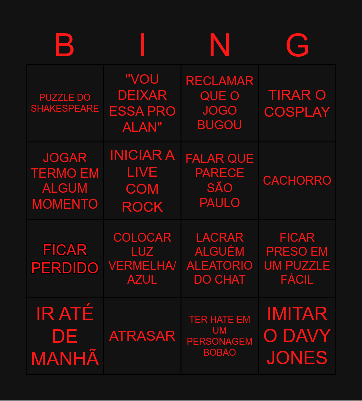 This bingo card has 16 words: ATRASAR, FICAR PRESO EM UM PUZZLE FÁCIL, RECLAMAR QUE O JOGO BUGOU, PUZZLE DO SHAKESPEARE, FICAR PERDIDO, ''VOU DEIXAR ESSA PRO ALAN'', LACRAR ALGUÉM ALEATORIO DO CHAT, TER HATE EM UM PERSONAGEM BOBÃO, JOGAR TERMO EM ALGUM MOMENTO, INICIAR A LIVE COM ROCK, IR ATÉ DE MANHÃ, TIRAR O COSPLAY, COLOCAR LUZ VERMELHA/ AZUL, CACHORRO, FALAR QUE PARECE SÃO PAULO and IMITAR O DAVY JONES.