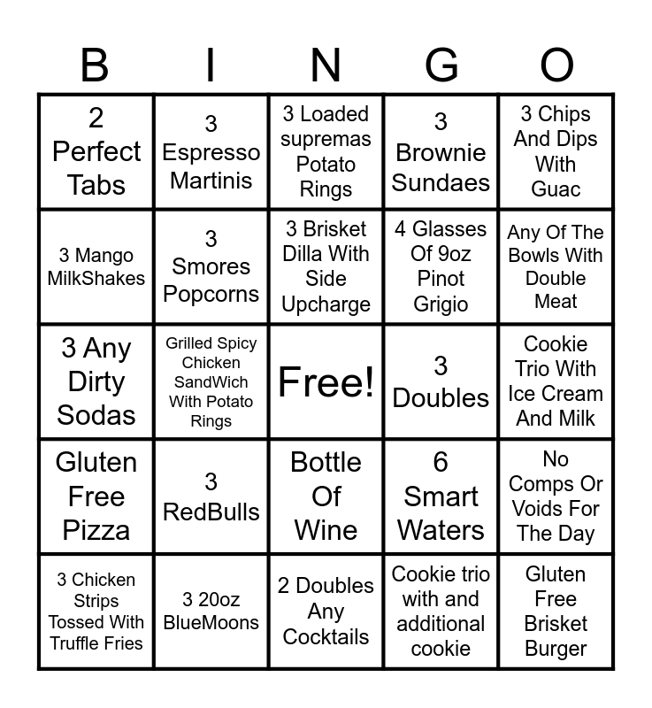 This bingo card has a free space and 24 words: 3 RedBulls, 3 20oz BlueMoons, 3 Brisket Dilla With Side Upcharge, 3 Chicken Strips Tossed With Truffle Fries, 3 Chips And Dips With Guac, 2 Perfect Tabs, 3 Mango MilkShakes, 3 Espresso Martinis, 3 Doubles, Bottle Of Wine, 4 Glasses Of 9oz Pinot Grigio, 3 Any Dirty Sodas, 6 Smart Waters, No Comps Or Voids For The Day, 3 Smores Popcorns, Cookie trio with and additional cookie, Cookie Trio With Ice Cream And Milk, 3 Loaded supremas Potato Rings, Any Of The Bowls With Double Meat, Grilled Spicy Chicken SandWich With Potato Rings, Gluten Free Brisket Burger, Gluten Free Pizza, 3 Brownie Sundaes and 2 Doubles Any Cocktails.