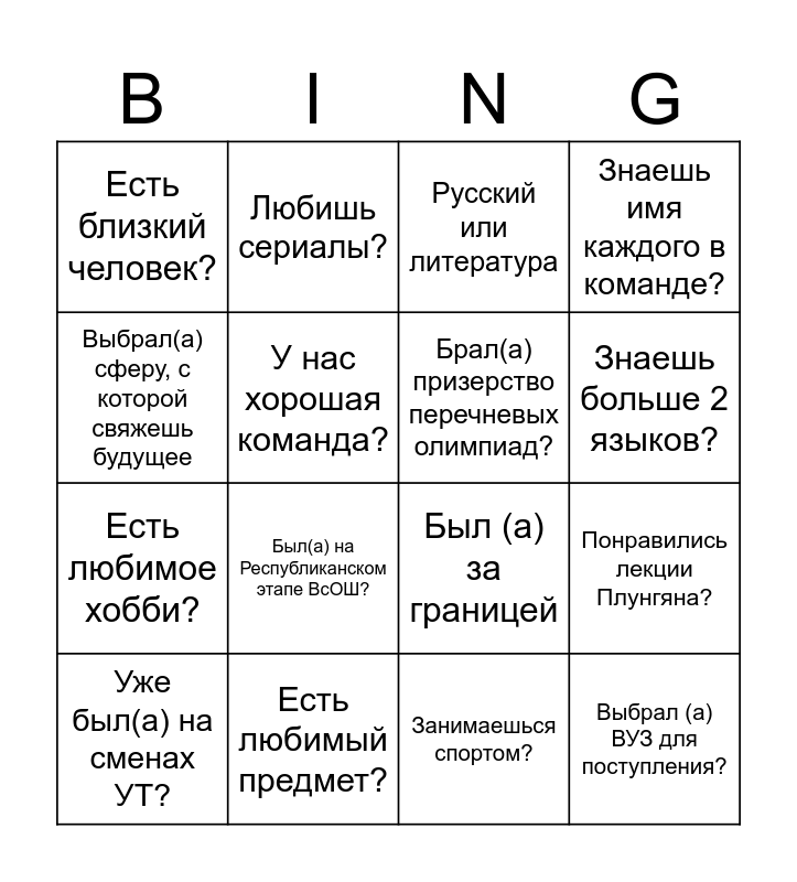 This bingo card has 18 words: Был(а) на Республиканском этапе ВсОШ?, Выбрал (а) ВУЗ для поступления?, Русский или литература, Есть близкий человек?, Был (а) за границей, Знаешь имя каждого в команде?, Уже был(а) на сменах УТ?, Любишь сериалы?, Знаешь больше 2 языков?, Есть любимое хобби?, Занимаешься спортом?, Выбрал(а) сферу, с которой свяжешь будущее, Понравились лекции Плунгяна?, У нас хорошая команда?, Брал(а) призерство перечневых олимпиад?, Был(а) в Артеке/Сириусе/Орленке?, Есть любимый предмет? and Правша?.
