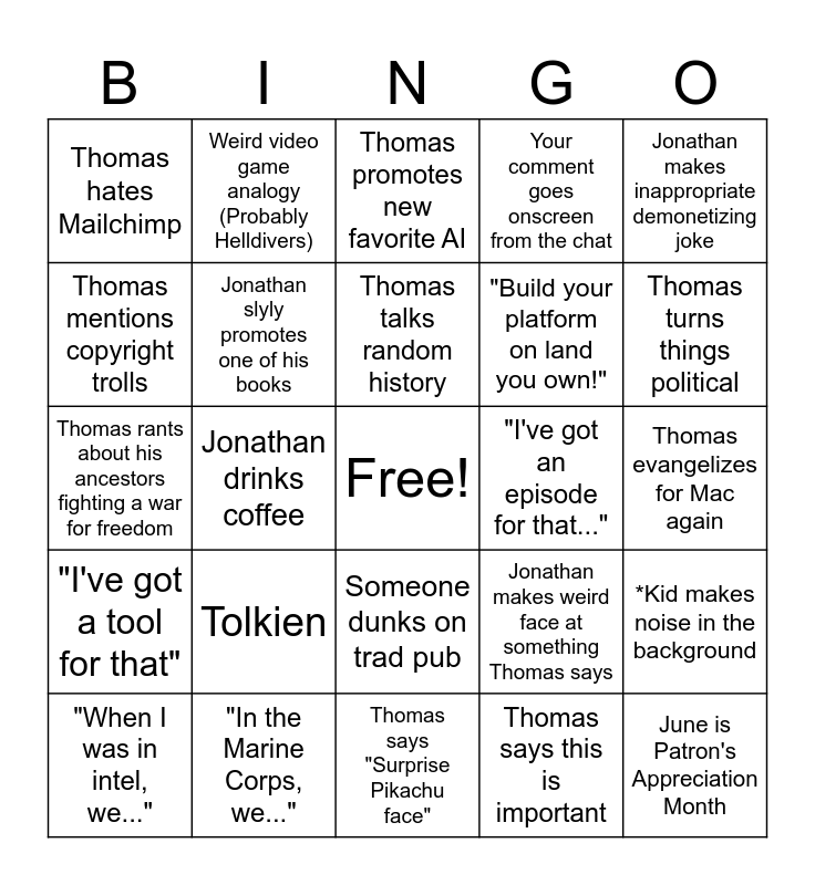 This bingo card has a free space and 24 words: Tolkien, "In the Marine Corps, we...", Thomas talks random history, "When I was in intel, we...", Jonathan makes inappropriate demonetizing joke, Thomas hates Mailchimp, Thomas mentions copyright trolls, Weird video game analogy (Probably Helldivers), "I've got an episode for that...", Someone dunks on trad pub, "Build your platform on land you own!", Thomas rants about his ancestors fighting a war for freedom, Jonathan makes weird face at something Thomas says, *Kid makes noise in the background, Jonathan slyly promotes one of his books, Thomas says this is important, Thomas evangelizes for Mac again, Thomas promotes new favorite AI, Thomas turns things political, Jonathan drinks coffee, June is Patron's Appreciation Month, "I've got a tool for that", Your comment goes onscreen from the chat and Thomas says "Surprise Pikachu face".