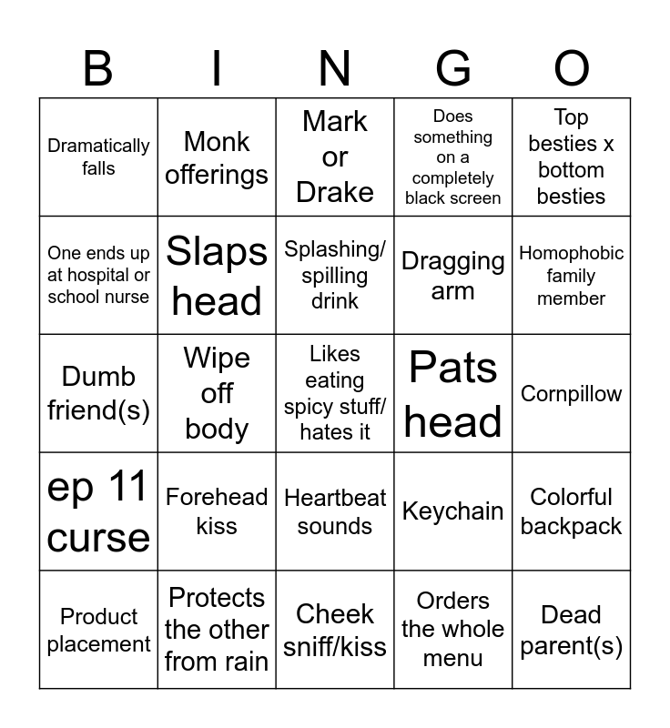 This bingo card has 85 words: AJ/JJ, Papang, Guy or Pod, Mark or Drake, Lookwa or Sammy, Pretends to sleep, Sleeping with lights on, Dog/Puppy, Goofy shirts, Invites themselves over, Sticky note message, Checks for fever, Stargazing, Slaps head, Pats head, Ikea/Sweden represented, Dramatically falls, Product placement, One ends up at hospital or school nurse, Stopped by the wrist, Break up, Fasten the others seatbelt, Dragging arm, Likes eating spicy stuff/ hates it, Healing wound, Wipe off body, Indirect kiss, Weird sounds, Forgets bag, Shower scene, Beach trip/ Mountain trip, Forehead kiss, Back hug, Mutual pining, Dumb friend(s), Dead parent(s), Leaning on shoulder, Cheek sniff/kiss, Engineers, ep 11 curse, Homophobic family member, Coming out, Time skip, Fingers, In college/ high school, Oishi, Enemies to lovers, Sulking and drinking, Physical fight, Rich boy, Temple, Monk offerings, Splashing/ spilling drink, Helping putting on/taking off helmet, Puts cold drink on cheek/neck, Panflag, Mall scene, Protects the other from rain, Does something on a completely black screen, Breaking into school, Cheating, Sitting on swings, Water war, Feeding, Gifts a bracelet, Swoosh, Top besties x bottom besties, Taking off glasses glow-up, Colorful backpack, Tickle chin, Sharing headphones, Smells themselves, Framed picture of themselve, Punished for getting late, Forced to study abroad/wants to, Doc, Heartbeat sounds, Orders the whole menu, Music club, Rooftop, Ear nibble, Cornpillow, Wiping away food, Arcade, Keychain and Camping.