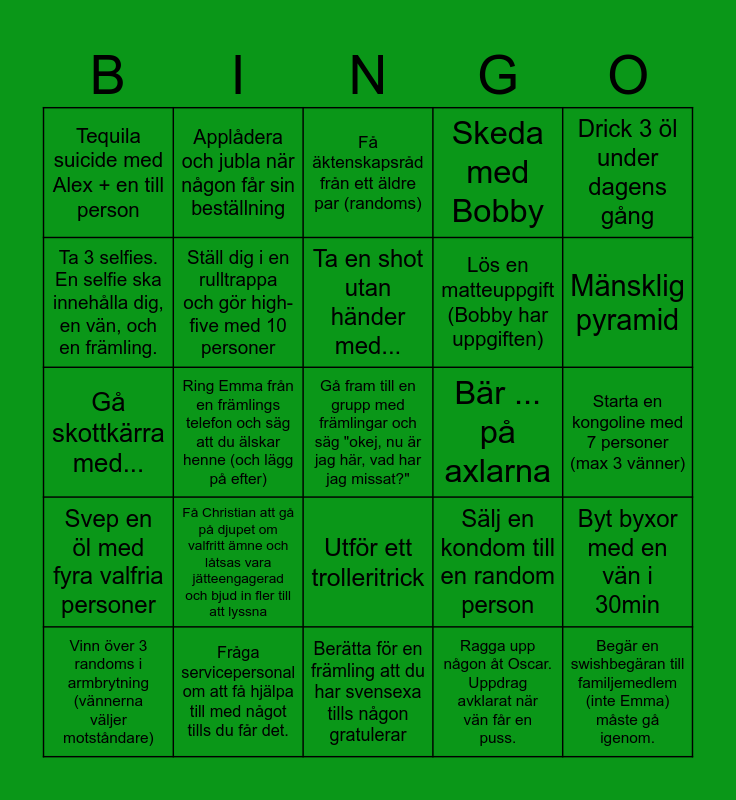 This bingo card has 25 words: Få Christian att gå på djupet om valfritt ämne och låtsas vara jätteengagerad och bjud in fler till att lyssna, Berätta för en främling att du har svensexa tills någon gratulerar, Ta en shot utan händer med..., Vinn över 3 randoms i armbrytning (vännerna väljer motståndare), Drick 3 öl under dagens gång, Tequila suicide med Alex + en till person, Ta 3 selfies. En selfie ska innehålla dig, en vän, och en främling., Applådera och jubla när någon får sin beställning, Bär ... på axlarna, Utför ett trolleritrick, Lös en matteuppgift (Bobby har uppgiften), Gå skottkärra med..., Sälj en kondom till en random person, Byt byxor med en vän i 30min, Ställ dig i en rulltrappa och gör high-five med 10 personer, Begär en swishbegäran till familjemedlem (inte Emma) måste gå igenom., Starta en kongoline med 7 personer (max 3 vänner), Få äktenskapsråd från ett äldre par (randoms), Mänsklig pyramid, Ring Emma från en främlings telefon och säg att du älskar henne (och lägg på efter), Gå fram till en grupp med främlingar och säg "okej, nu är jag här, vad har jag missat?", Fråga servicepersonal om att få hjälpa till med något tills du får det., Svep en öl med fyra valfria personer, Skeda med Bobby and Ragga upp någon åt Oscar. Uppdrag avklarat när vän får en puss..