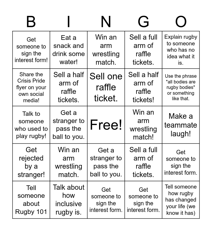 This bingo card has a free space and 24 words: Win an arm wrestling match., Talk about how inclusive rugby is., Sell one raffle ticket., Tell someone about Rugby 101, Explain rugby to someone who has no idea what it is., Get someone to sign the interest form!, Share the Crisis Pride flyer on your own social media!, Eat a snack and drink some water!, Win an arm wrestling match!, Get a stranger to pass the ball to you., Sell a half arm of raffle tickets!, Talk to someone who used to play rugby!, Sell a full arm of raffle tickets., Get someone to sign the interest form., Sell a half arm of raffle tickets., Get someone to sign the interest form., Make a teammate laugh!, Win an arm wrestling match., Use the phrase "all bodies are rugby bodies" or something like that., Get a stranger to pass the ball to you., Tell someone how rugby has changed your life (we know it has), Get rejected by a stranger!, Sell a full arm of raffle tickets. and Get someone to sign the interest form..