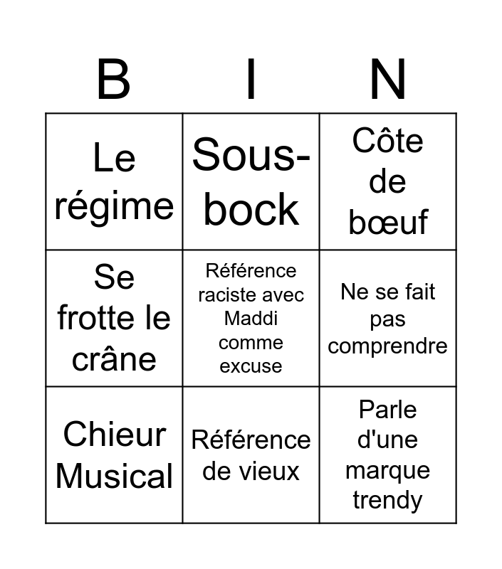This bingo card has a free space and 8 words: Ne se fait pas comprendre, Côte de bœuf, Sous-bock, Chieur Musical, Le régime, Parle d'une marque trendy, Se frotte le crâne and Référence de vieux.