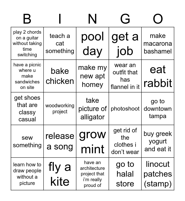 This bingo card has 25 words: release a song, have an architecture project that i’m really proud of, make my new apt homey, learn how to draw people without a picture, make macarona bashamel, play 2 chords on a guitar without taking time switching, have a picnic where u make sandwiches on site, teach a cat something, photoshoot, grow mint, wear an outfit that has flannel in it, get shoes that are classy casual, get rid of the clothes i don’t wear, buy greek yogurt and eat it, bake chicken, linocut patches (stamp), go to downtown tampa, pool day, eat rabbit, woodworking project, take picture of alligator, fly a kite, sew something, get a job and go to halal store.