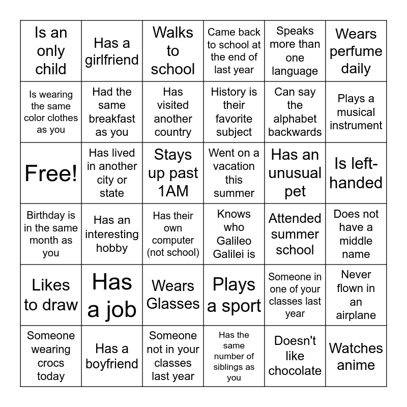 This bingo card has 36 words: Plays a sport, Wears Glasses, Has the same number of siblings as you, Is wearing the same color clothes as you, Birthday is in the same month as you, Went on a vacation this summer, Had the same breakfast as you, Someone not in your classes last year, Speaks more than one language, Someone in one of your classes last year, Plays a musical instrument, Came back to school at the end of last year, Never flown in an airplane, Has lived in another city or state, History is their favorite subject, Is an only child, Likes to draw, Has an unusual pet, Free!, Walks to school, Stays up past 1AM, Has an interesting hobby, Knows who Galileo Galilei is, Has their own computer (not school), Attended summer school, Has a girlfriend, Can say the alphabet backwards, Has a boyfriend, Has visited another country, Wears perfume daily, Watches anime, Someone wearing crocs today, Does not have a middle name, Is left-handed, Has a job and Doesn't like chocolate.