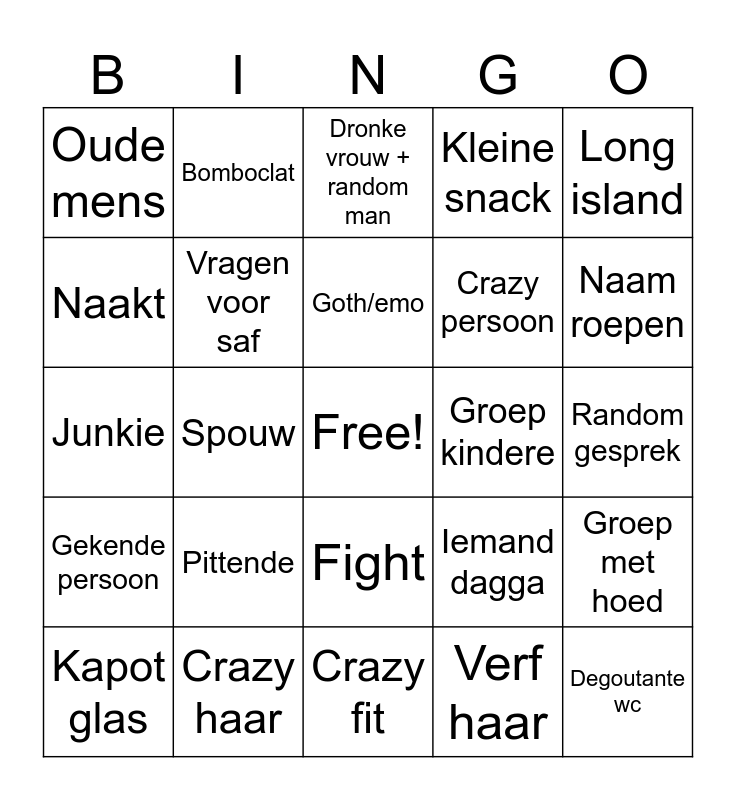 This bingo card has a free space and 24 words: Kapot glas, Pittende, Goth/emo, Verf haar, Long island, Oude mens, Bomboclat, Dronke vrouw + random man, Groep kindere, Random gesprek, Junkie, Vragen voor saf, Iemand dagga, Groep met hoed, Naakt, Crazy haar, Crazy fit, Kleine snack, Naam roepen, Gekende persoon, Spouw, Fight, Crazy persoon and Degoutante wc.