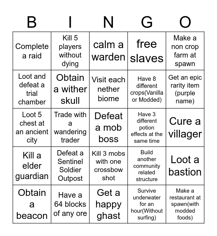 This bingo card has a free space and 24 words: Defeat a Sentinel Soldier Outpost, Have a 64 blocks of any ore, Visit each nether biome, Obtain a beacon, Make a non crop farm at spawn, Complete a raid, Loot and defeat a trial chamber, Kill 5 players without dying, Have 3 different potion effects at the same time, Kill 3 mobs with one crossbow shot, Have 8 different crops(Vanilla or Modded), Loot 5 chest at an ancient city, Build another community related structure, Loot a bastion, Obtain a wither skull, Survive underwater for an hour(Without surfing), Cure a villager, calm a warden, Get an epic rarity item (purple name), Trade with a wandering trader, Make a restaurant at spawn(with modded foods), Kill a elder guardian, free slaves and Get a happy ghast.