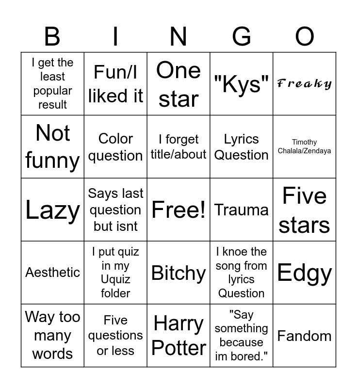 This bingo card has a free space and 24 words: I put quiz in my Uquiz folder, Five questions or less, I forget title/about, Way too many words, 𝓕𝓻𝓮𝓪𝓴𝔂, I get the least popular result, Not funny, Fun/I liked it, Trauma, Bitchy, Lyrics Question, Lazy, I knoe the song from lyrics Question, Edgy, Color question, "Say something because im bored.", Five stars, One star, Timothy Chalala/Zendaya, Says last question but isnt, Fandom, Aesthetic, "Kys" and Harry Potter.