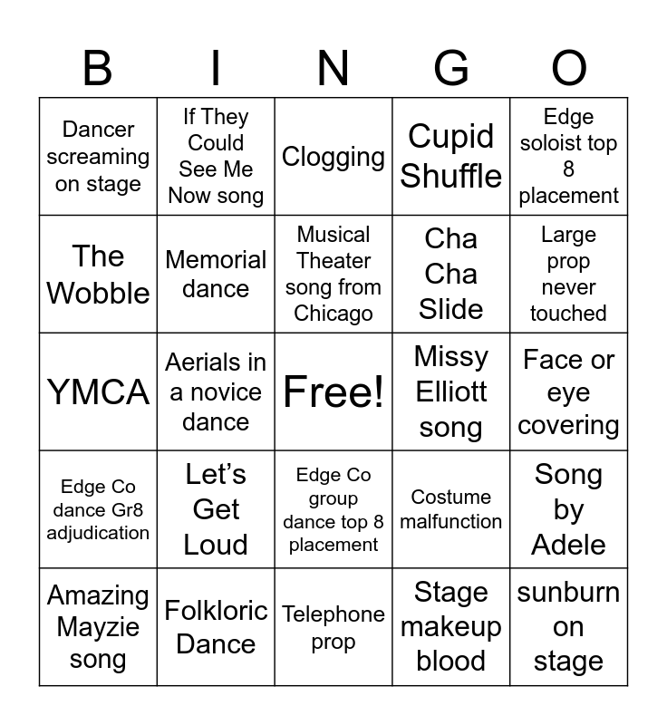 This bingo card has a free space and 31 words: Telephone prop, Acro trick in tap shoes, Aerials in a novice dance, Medical equipment prop, Dancer screaming on stage, Clogging, Memorial dance, Costume malfunction, Missy Elliott song, Stage makeup blood, Face or eye covering, sunburn on stage, Pool hair on stage, Dancer with nude look costume, Large prop never touched, Feather on stage, Song by Adele, Let’s Get Loud, Edge Co dance Gr8 adjudication, Edge Co group dance top 8 placement, Edge soloist top 8 placement, Hozier song, Amazing Mayzie song, If They Could See Me Now song, Cha Cha Slide, The Wobble, Cupid Shuffle, YMCA, Folkloric Dance, Musical Theater song from Chicago and Petites twerking.