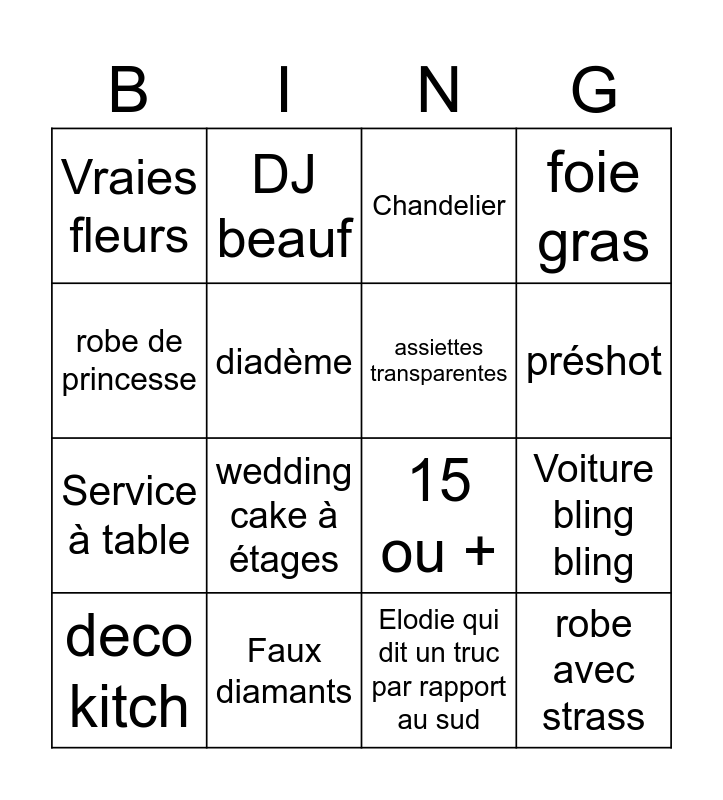 This bingo card has 16 words: Faux diamants, Voiture bling bling, Chandelier, Vraies fleurs, Service à table, DJ beauf, 15 ou +, Elodie qui dit un truc par rapport au sud, robe de princesse, diadème, deco kitch, foie gras, wedding cake à étages, préshot, assiettes transparentes and robe avec strass.