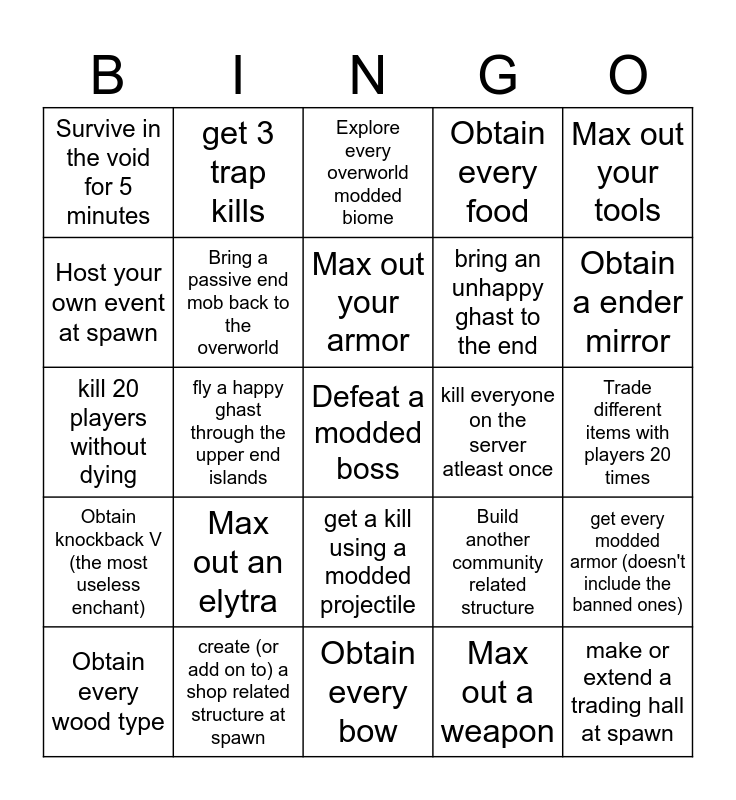 This bingo card has a free space and 24 words: Obtain every wood type, Max out an elytra, Max out your armor, Max out a weapon, Max out your tools, Survive in the void for 5 minutes, get 3 trap kills, Explore every overworld modded biome, kill everyone on the server atleast once, Trade different items with players 20 times, kill 20 players without dying, Bring a passive end mob back to the overworld, Build another community related structure, get every modded armor (doesn't include the banned ones), Host your own event at spawn, create (or add on to) a shop related structure at spawn, Obtain every bow, Obtain every food, Obtain a ender mirror, Obtain knockback V (the most useless enchant), fly a happy ghast through the upper end islands, get a kill using a modded projectile, bring an unhappy ghast to the end and make or extend a trading hall at spawn.