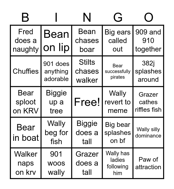 This bingo card has a free space and 24 words: Wally beg for fish, 901 woos wally, Stilts chases walker, Walker naps on krv, 909 and 910 together, Fred does a naughty, Chuffies, Bean on lip, Wally revert to meme, Biggie does a tall, Bear successfully pirates, Bear sploot on KRV, Big bear splashes on bf, Wally silly dominance, 901 does anything adorable, Wally has ladies following him, Grazer cathes riffles fish, Bean chases boar, 382j splashes around, Biggie up a tree, Paw of attraction, Bear in boat, Big ears called out and Grazer does a tall.