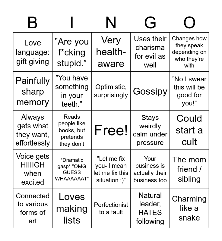 This bingo card has a free space and 24 words: *Dramatic gasp* ”OMG GUESS WHAAAAAAT”, Loves making lists, Optimistic, surprisingly, Connected to various forms of art, Changes how they speak depending on who they’re with, Love language: gift giving, Painfully sharp memory, ”Are you f*cking stupid.”, Stays weirdly calm under pressure, ”Let me fix you- I mean let me fix this situation :)”, Gossipy, Always gets what they want, effortlessly, Your business is actually their business too, The mom friend / sibling, ”You have something in your teeth.”, Natural leader, HATES following, Could start a cult, Very health-aware, ”No I swear this will be good for you!”, Reads people like books, but pretends they don’t, Charming like a snake, Voice gets HIIIIGH when excited, Uses their charisma for evil as well and Perfectionist to a fault.