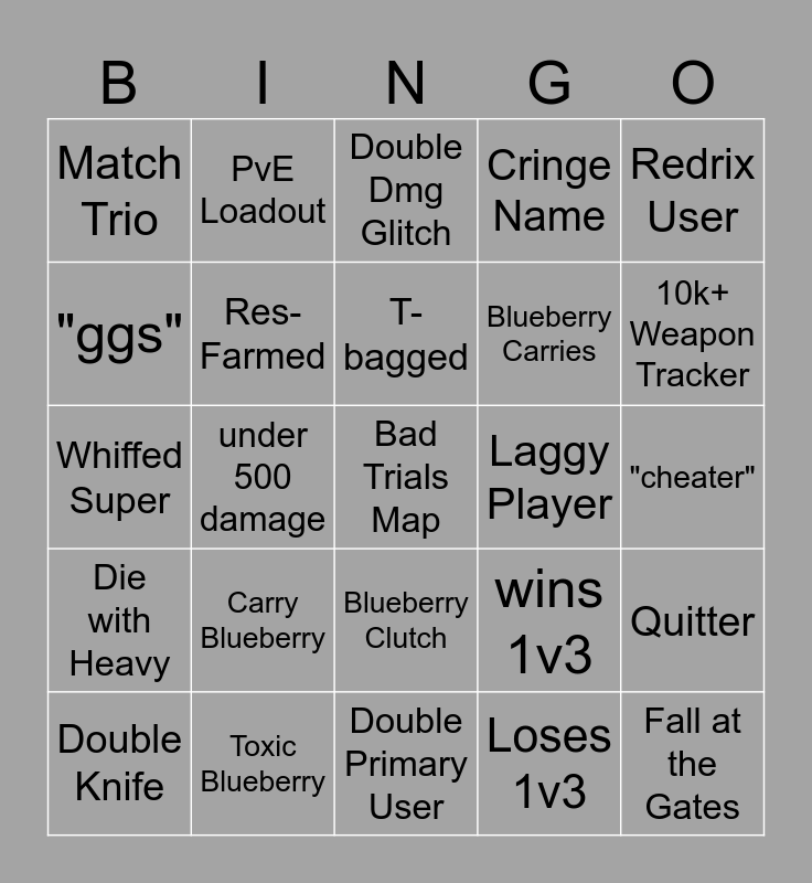 This bingo card has a free space and 24 words: Carry Blueberry, Toxic Blueberry, T-bagged, Double Knife, Redrix User, Match Trio, "ggs", PvE Loadout, Laggy Player, Blueberry Clutch, Blueberry Carries, Whiffed Super, wins 1v3, Quitter, Res-Farmed, Loses 1v3, "cheater", Double Dmg Glitch, 10k+ Weapon Tracker, under 500 damage, Fall at the Gates, Die with Heavy, Cringe Name and Double Primary User.