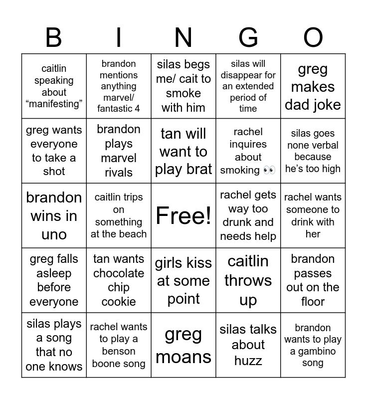 This bingo card has a free space and 24 words: tan wants chocolate chip cookie, rachel wants to play a benson boone song, tan will want to play brat, silas plays a song that no one knows, greg makes dad joke, caitlin speaking about “manifesting”, greg wants everyone to take a shot, brandon mentions anything marvel/ fantastic 4, rachel gets way too drunk and needs help, girls kiss at some point, rachel inquires about smoking 👀, brandon wins in uno, caitlin throws up, brandon passes out on the floor, brandon plays marvel rivals, silas talks about huzz, rachel wants someone to drink with her, silas begs me/ cait to smoke with him, silas goes none verbal because he’s too high, caitlin trips on something at the beach, brandon wants to play a gambino song, greg falls asleep before everyone, silas will disappear for an extended period of time and greg moans.