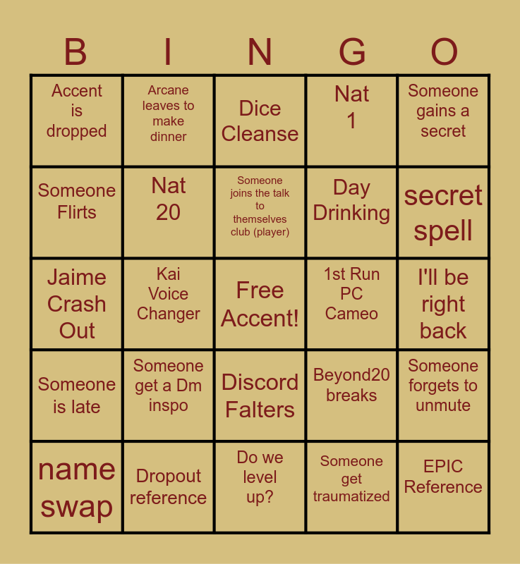 This bingo card has 1 images, a free space and 49 words: 1st Run is mentioned, EPIC Reference, Gavel, Do we level up?, Someone get a Dm inspo, Jukebox fail, Arcane leaves to make dinner, Tommy appearance, Someone Flirts, Kai/Luci simps over Logan, Nat 20, Nat 1, Someone forgets to unmute, Beyond20 breaks, A God Shows up, Ordep threatens someone, Someone joins the talk to themselves club (player), 1st Run PC Cameo, Town from video game mention, Someone gains a secret, Kai Voice Changer, Someone get traumatized, Accent is dropped, Day Drinking, Bad Joke is made, Snacks, secret spell, wrong roll, Dice Cleanse, Discord Falters, "English is hard", Confusion (someone misunderstands something), BG3 Reference, Someone references something that doesn't exist in world, Dropout reference, DM snacks, Math is hard, The more you learn, 'ARCANETAILS', I'll be right back, curse, forgets drugs, "That's what she said", dance Break, name swap, Jaime Crash Out, Internet assassinates Jae, Try not to get Cancelled Challenge (says something that has to get cut out) and Someone is late.