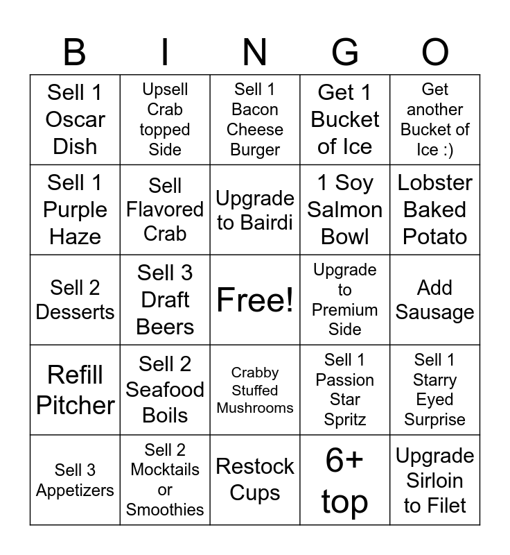 This bingo card has a free space and 24 words: Sell 3 Appetizers, Sell 2 Seafood Boils, Upgrade to Bairdi, 6+ top, Get another Bucket of Ice :), Sell 1 Oscar Dish, Upsell Crab topped Side, Sell 1 Bacon Cheese Burger, Upgrade to Premium Side, Add Sausage, Sell 2 Desserts, Sell Flavored Crab, Sell 1 Passion Star Spritz, Sell 1 Starry Eyed Surprise, Sell 1 Purple Haze, Sell 2 Mocktails or Smoothies, Restock Cups, Get 1 Bucket of Ice, Lobster Baked Potato, Refill Pitcher, Sell 3 Draft Beers, Crabby Stuffed Mushrooms, 1 Soy Salmon Bowl and Upgrade Sirloin to Filet.