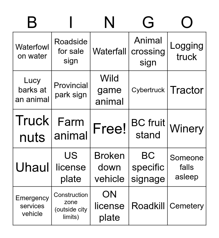 This bingo card has a free space and 24 words: US license plate, Construction zone (outside city limits), Wild game animal, Emergency services vehicle, Logging truck, Waterfowl on water, Lucy barks at an animal, Roadside for sale sign, BC fruit stand, Broken down vehicle, Cybertruck, Truck nuts, BC specific signage, Someone falls asleep, Provincial park sign, Roadkill, Winery, Waterfall, Tractor, Farm animal, Cemetery, Uhaul, Animal crossing sign and ON license plate.