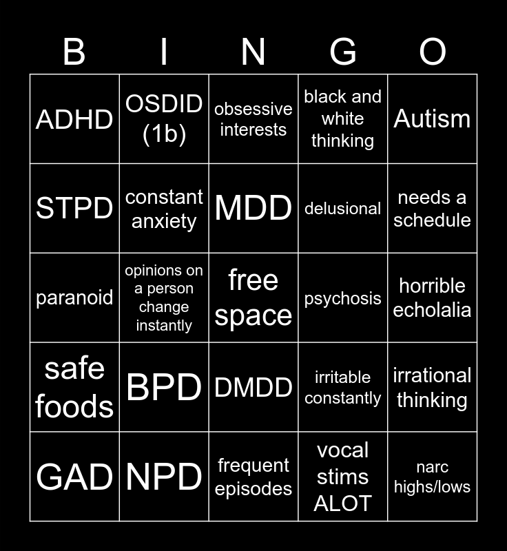 This bingo card has a free space and 24 words: BPD, NPD, MDD, GAD, Autism, ADHD, STPD, OSDID (1b), psychosis, DMDD, delusional, paranoid, irritable constantly, irrational thinking, constant anxiety, vocal stims ALOT, horrible echolalia, obsessive interests, needs a schedule, opinions on a person change instantly, narc highs/lows, safe foods, black and white thinking and frequent episodes.