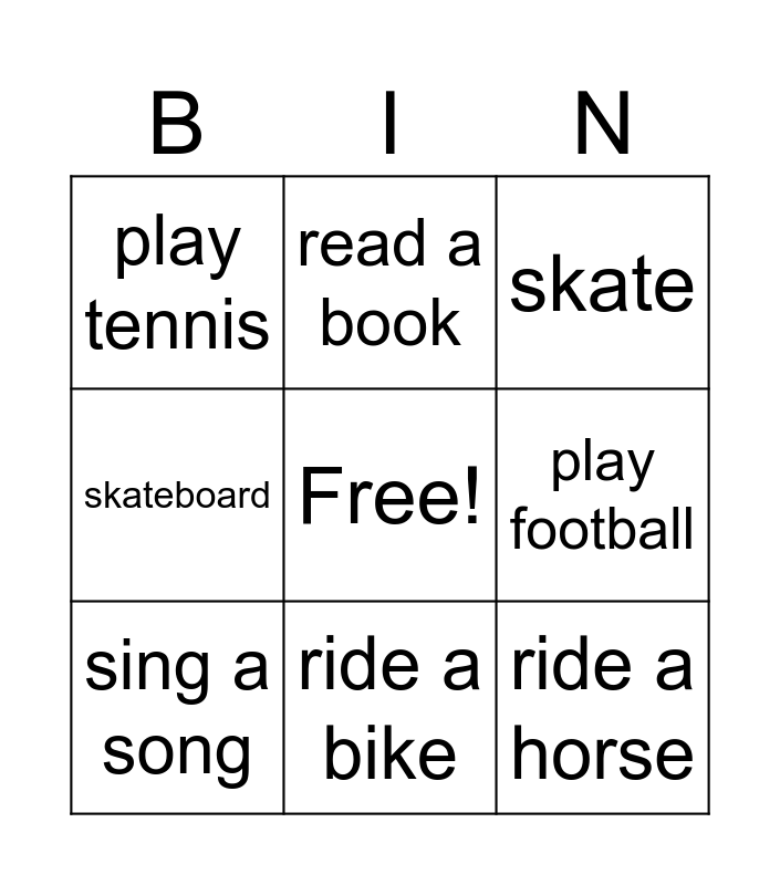 This bingo card has a free space and 9 words: sing a song, read a book, play football, play tennis, skate, skateboard, ride a bike, ride a horse and play piano.